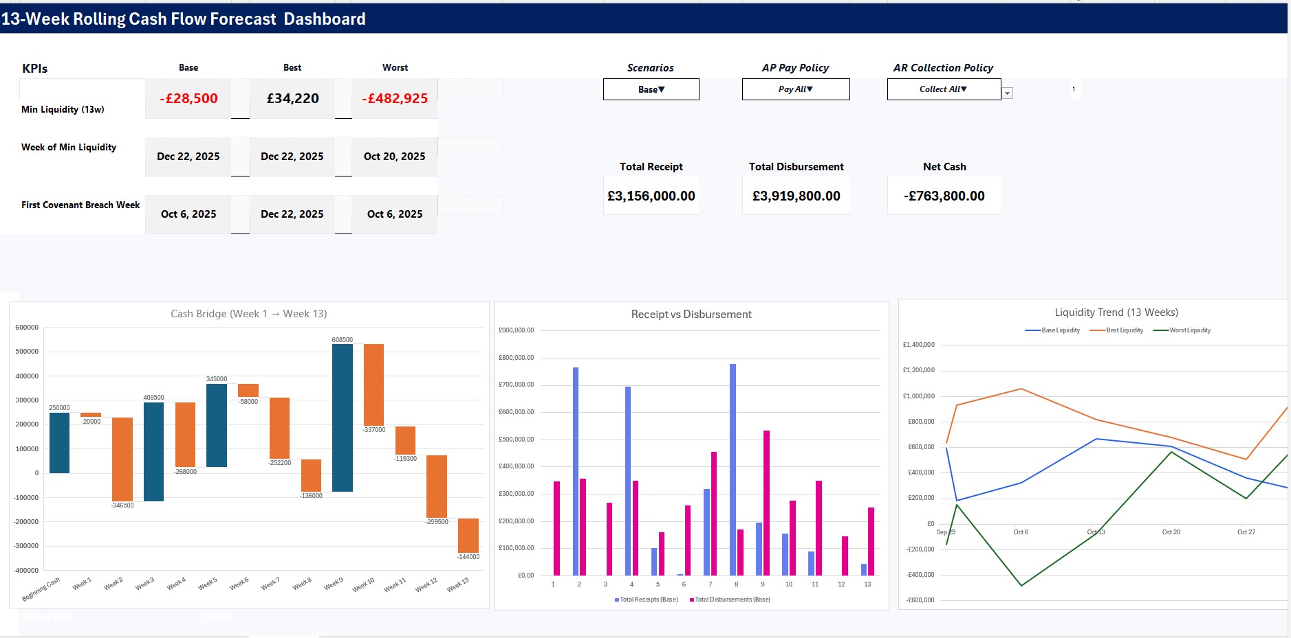 Take full control of your business cash with this intelligent 13-week cashflow model built for real-world decision-making. It offers rolling cashflow tracking forecast, scenario planning (Base, Best, Worst), and an interactive dashboard that turns data into instant insights.